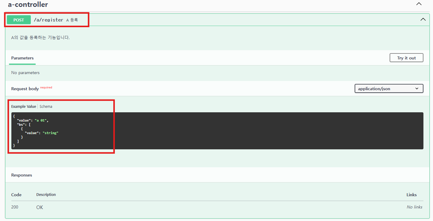 @Operation(summary = "A 등록", description = "A의 값을 등록하는 기능입니다.")