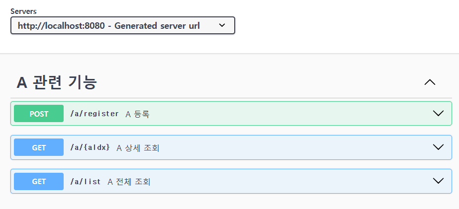 @RequiredArgsConstructor @RequestMapping("/a") @RestController @Tag(name = "A 관련 기능") public class AController { private final AService aService; @Operation(summary = "A 등록", description = "A의 값을 등록하는 기능입니다.") @PostMapping("/register") public void register(@RequestBody ADto.ARegister dto) { aService.register(dto); } @Operation(summary = "A 상세 조회", description = "A의 idx 값으로 A를 조회하는 기능입니다.") @GetMapping("/{aIdx}") public ResponseEntity get(@PathVariable Long aIdx) { ADto.AResponse response = aService.get(aIdx); return ResponseEntity.ok().body(response); } @Operation(summary = "A 전체 조회", description = "A의 전체 목록을 조회하는 기능입니다.") @GetMapping("/list") public ResponseEntity getList() { List<ADto.AResponse> response = aService.list(); return ResponseEntity.ok().body(response); } }