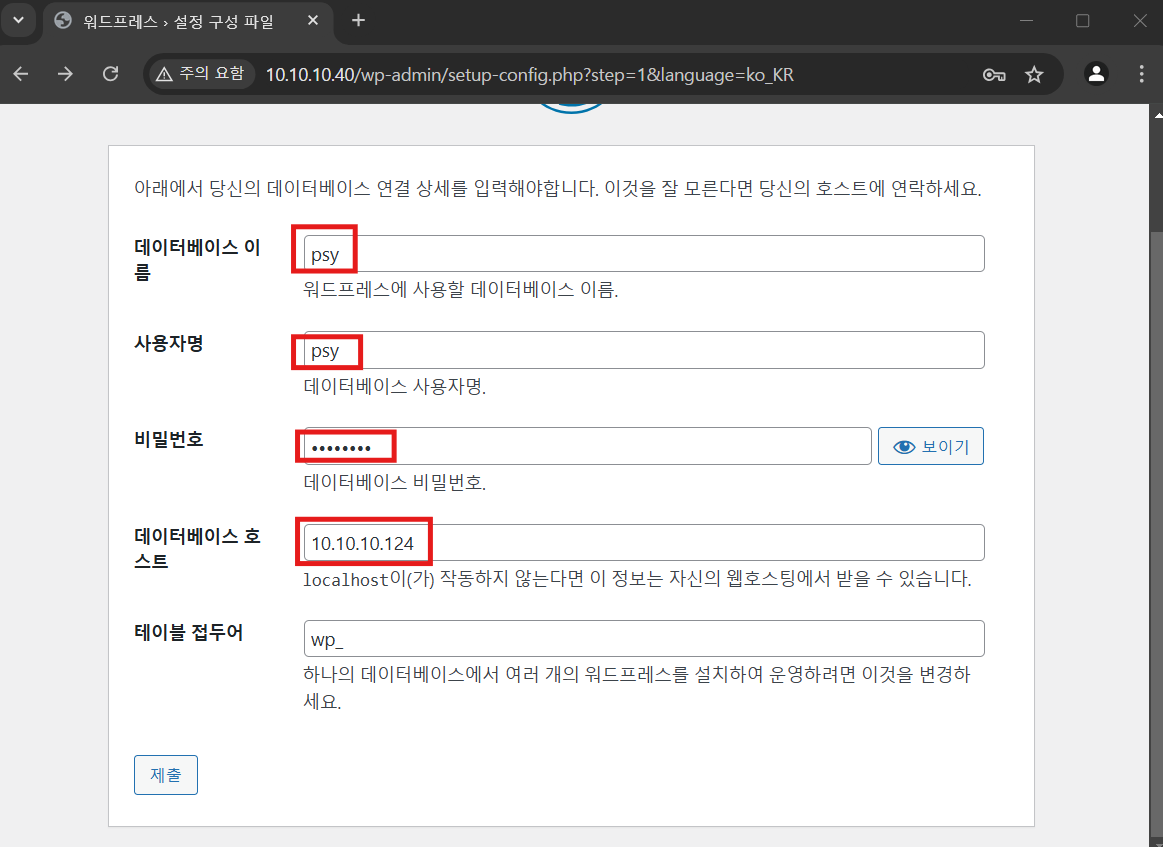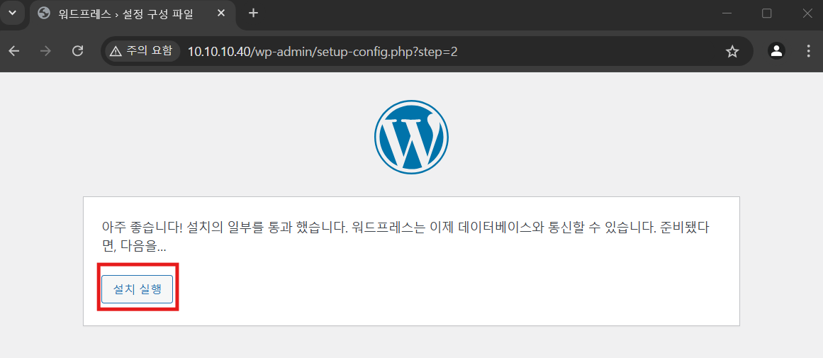 입력 후 워드프레스 설치 클릭