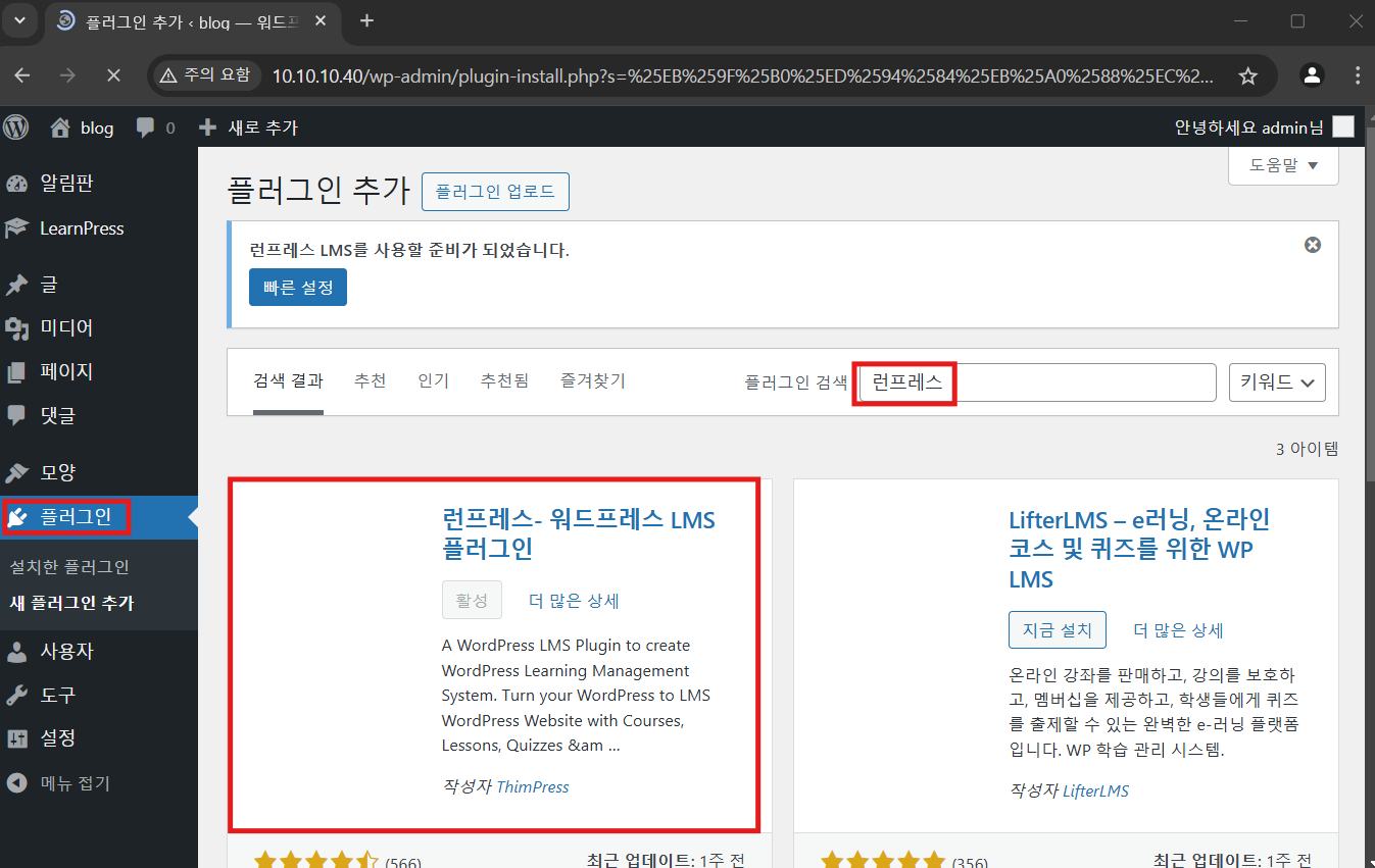 왼쪽 탭에 플러그인 -> 런프레스 검색 -> 설치