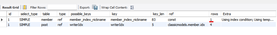 EXPLAIN으로 봤을 때 같은 쿼리를 실행했을 때 더 적은 행을 조회하는 것을 볼 수 있다.