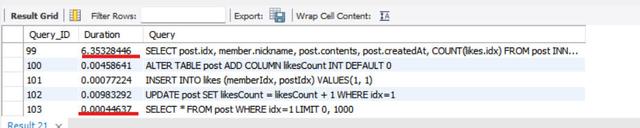 SHOW PROFILE FOR QUERY 21; # 특정 쿼리의 실행 과정 상세 조회