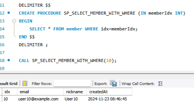 CALL SP_SELECT_MEMBER_WITH_WHERE(10);