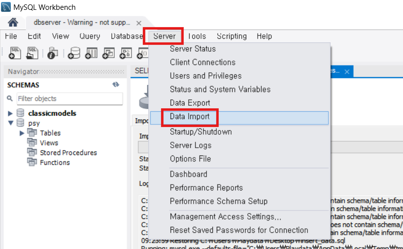 3. Default Schema로 Import 할 디비를 선택하고 Start Import 클릭