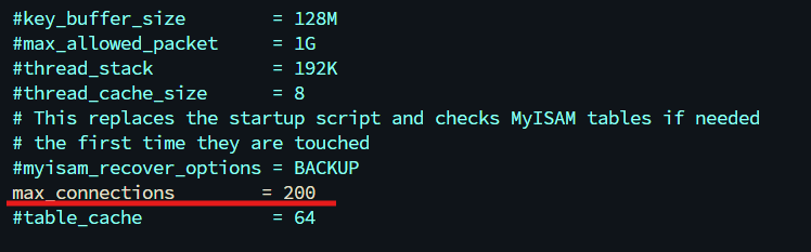 max_connections = 200 으로 바꿔준 후 주석 처리를 제거해준다.