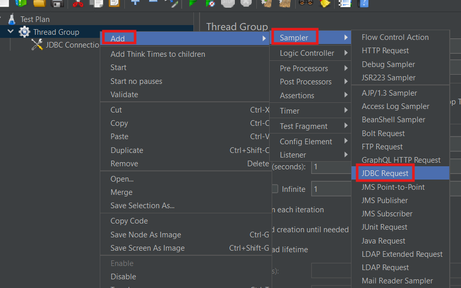 Thread Group 우클릭 -> Add -> Sampler -> JDBC Request
